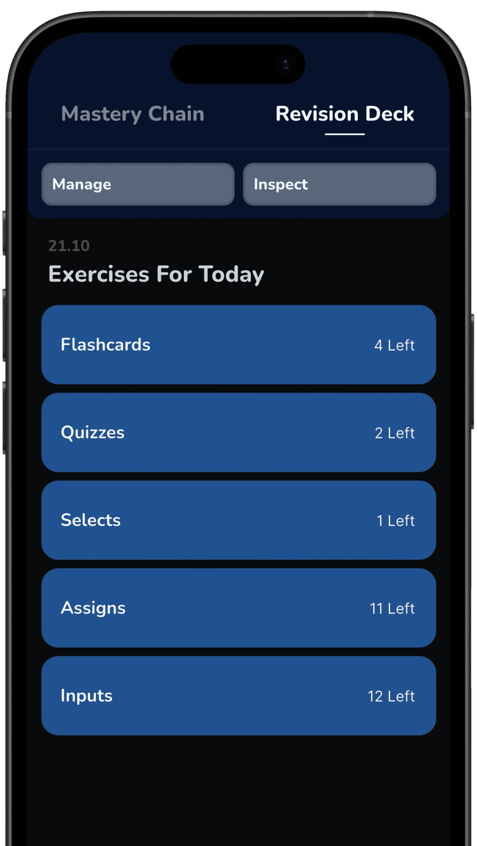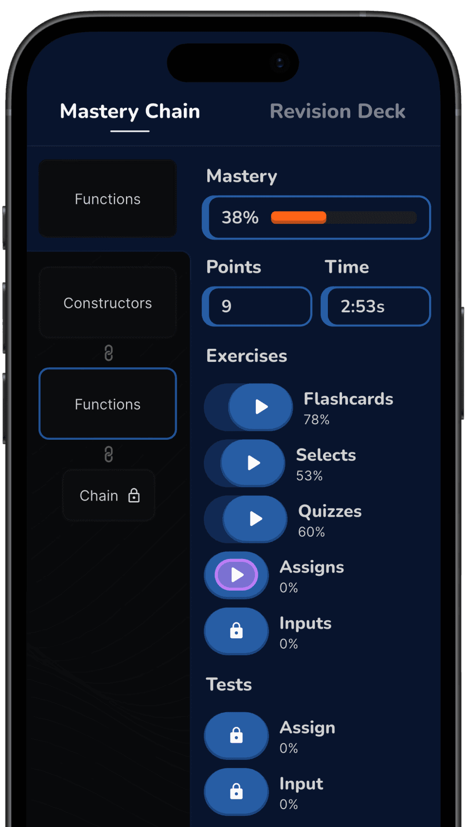 Choose what you want to improve at, one category at a time. Grasp knowledge with Mastery Chain. Preserve it with Revision Deck.