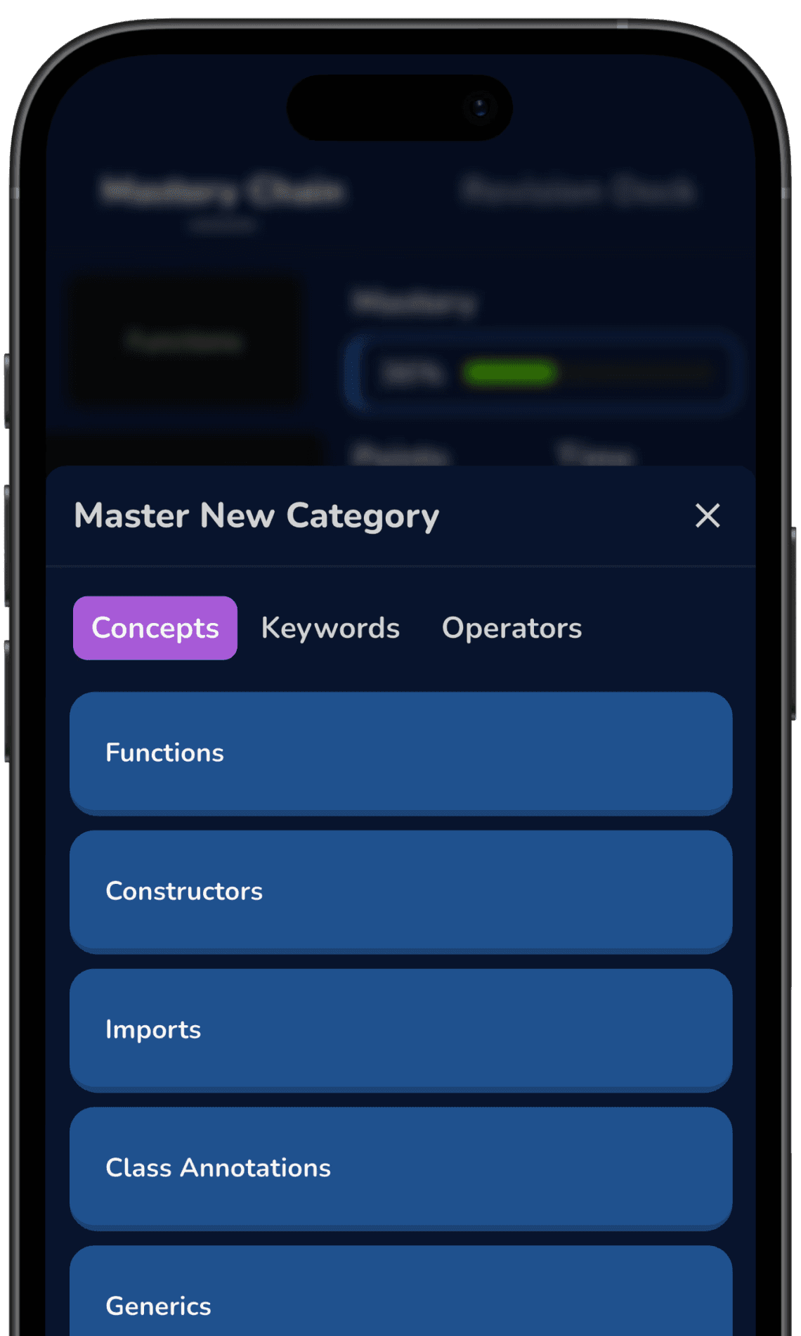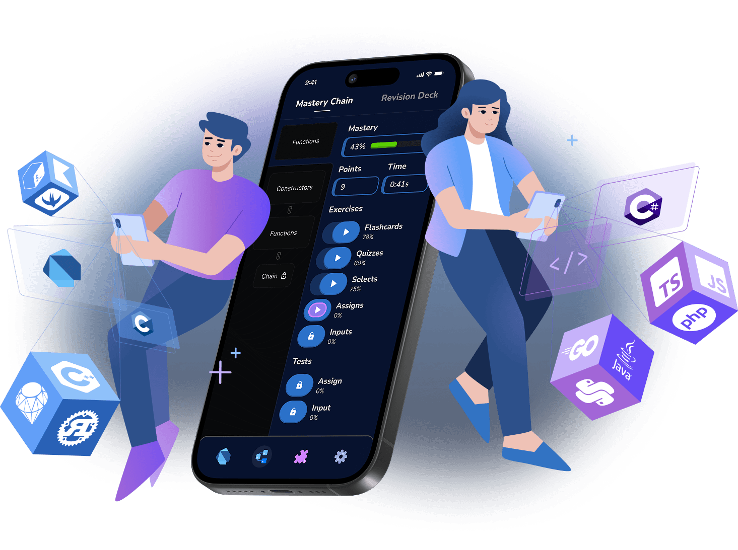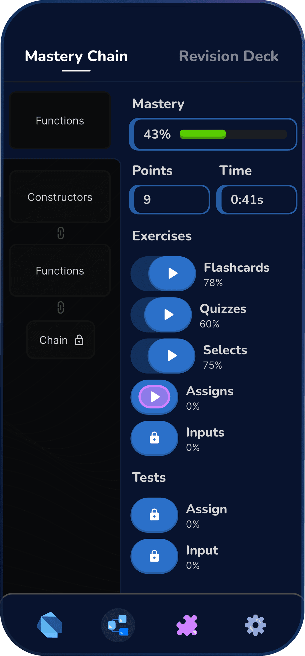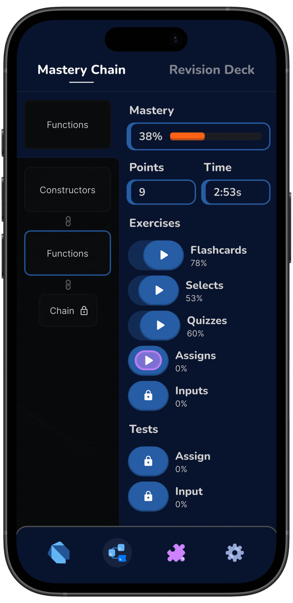 Choose what you want to improve at, one category at a time. Grasp knowledge with Mastery Chain. Preserve it with a Revision Deck.